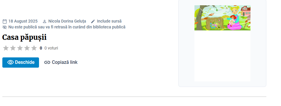 Textul literar Casa păpușii, după Titel Constantinescu, este unul literar, iar prin această secvență de lecție se urmărește manifestarea interesului față de activități prin participarea activă.
