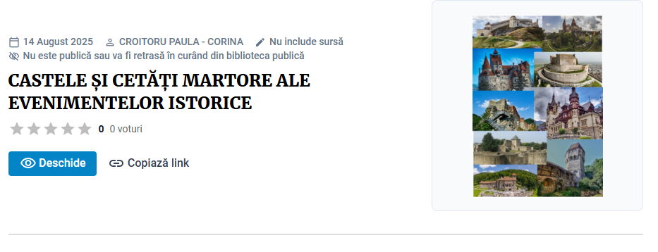 Lecția interactivă de istorie cu tema „Castele și cetăți martore ale evenimentelor istorice” pentru clasa a IV-a îi poartă pe elevi într-o călătorie vizuală, prin imagini și filmulețe, descoperind astfel frumusețea și rolul acestor construcții.Sunt prezentate principalele castele și cetăți din România , explicând elementele lor componente (turnuri, ziduri, porți, șanțuri, curți interioare, capele), rolul pe care l-au avut în trecut , întemeietorii lor și localizarea pe hartă .Lecția include imagini,materiale video și audio, rebus, chestionare și evaluarea finală , combinând informația istorică cu activități ludice pentru o învățare atractivă și interactivă.
