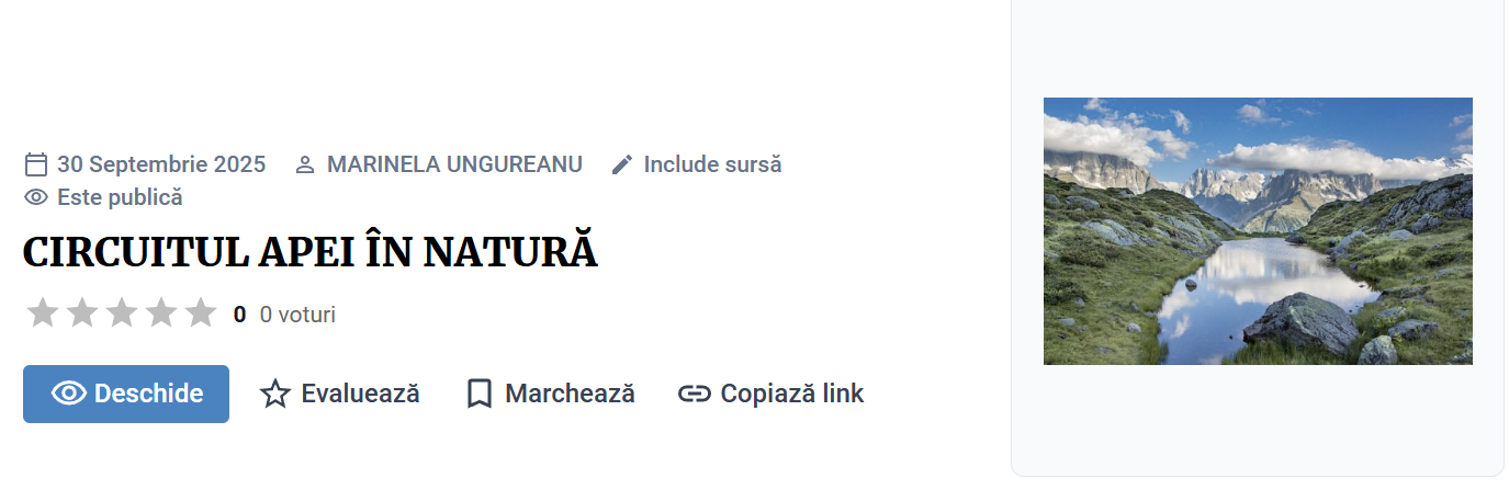 Elevii vor învăța despre drumul permanent pe care apa îl face, denumit ,,Circuitul apei în natură”. Ei vor ști să precizeze traseul urmat de apă, stările de agregare prin care aceasta trece, denumirea fenomenelor ce duc la modificări ale apei și la formarea precipitațiilor. Resursa este creată pe platforma Livresq și conține imagini, un video (YouTube), un chestionar și o diplomă printabilă.