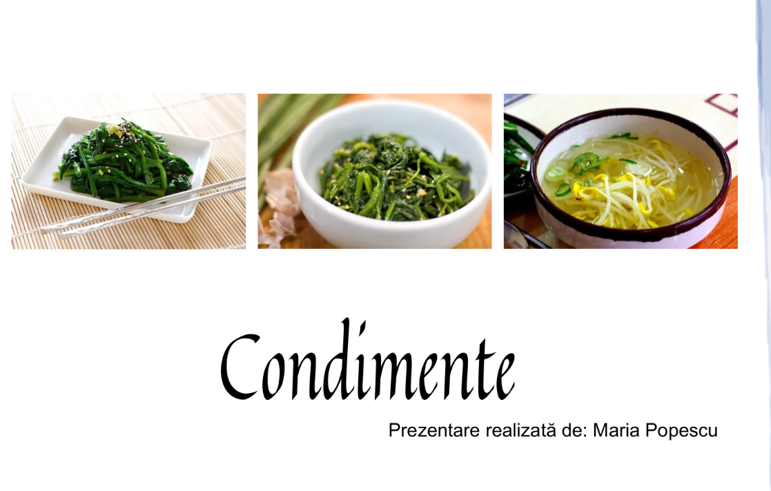 Condimentele sunt substanțe naturale sau sintetice utilizate pentru a adăuga aromă, gust, culoare sautextură alimentelor. Acestea pot fi obținute din plante, semințe, rădăcini, coji sau alte părți ale plantelor, șipot fi utilizate sub formă de pulbere, boabe sau uleiuri esențiale. Condimentele nu doar că îmbogățesc gustulpreparatelor, dar au și diverse beneficii pentru sănătate, având proprietăți antioxidante, antiinflamatorii saudigestive. Printre cele mai comune condimente se numără piperul, sarea, ardeiul iute, busuiocul, coriandrul,cimbrul și scorțișoara.