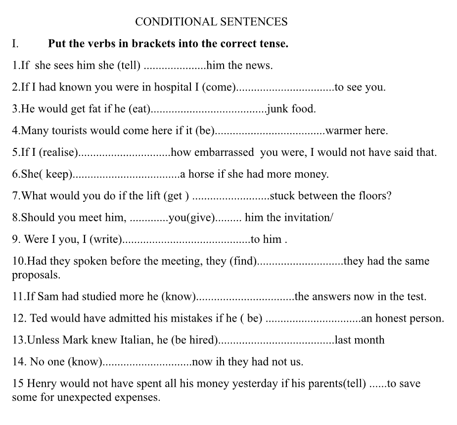 Fișa de lucru evaluează propozițiile condiționale prin completarea spațiilor libere cu forma verbală corectă.