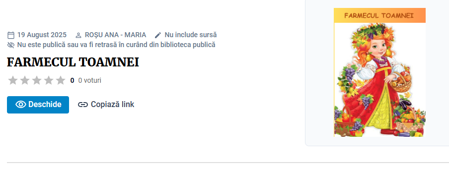 FARMECUL TOAMNEIDESCRIEREA LECȚIEILecția „Farmecul toamnei” este destinată copiilor de vârstă preșcolară și are ca obiectiv familiarizarea acestora cu principalele aspecte ale anotimpului toamna. Activitatea debutează cu un moment de captare a atenției, prin ghicitori despre anotimpuri. În continuare, sunt prezentate imagini sugestive și un filmuleț cu peisaje de toamnă, roade bogate din livezi și grădini, frunze multicolore, dar și cu activități specifice oamenilor în acest anotimp. Copiii sunt încurajați să observe, să descrie și să răspundă la întrebări simple despre ceea ce văd.În lecție sunt incluse și jocuri interactive Wordwall, aceste exerciții având rolul de a consolida cunoștințele dobândite și de a stimula atenția și gândirea copiilor .La final, a fost integrată o evaluare interactivă. Rezultatele au fost discutate în mod pozitiv și încurajator, accentul fiind pus pe participare și pe bucuria învățării. Activitatea s-a încheiat cu un mesaj de mulțumire adresat copiilor pentru implicarea lor activă, apreciindu-se veselia, curiozitatea și răspunsurile istețe care au transformat lecția într-o experiență la fel de colorată și bogată precum toamna însăși.