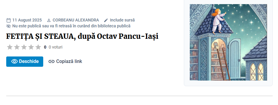 ”Fetița și steaua”, după Ocatv Pancu -Iași este este o lecție interactivă pentru disciplina Comunicare în limba română, fiind destinată elevilor de clasa a II-a și urmărește dezvoltarea competențelor de lectură și înțelegere a unui text literar, de exprimare orală și scrisă, într-un mod accesibil și atractiv.