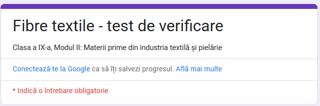 Această resursă educațională deschisă este un test de verificare a cunoștințelor la finalul capitolului ”Fibre textile”. Se adresează elevilor de liceu tehnologic, clasa a IX-a din domeniul de pregătire INDUSTRIE TEXTILĂ ȘI PIELĂRIE. L-am conceput pentru clasele cu specializarea profesională TEHNICIAN DESIGNER VESTIMENTAR, Modulul II : Materii prime în îndustria textilă și pielărie, în conformitate cu programa școlară aprobata prin OMENCS nr. 4457 din 05.07.2016, Anexa nr. 3.Conform Standardului de Pregătire Profesională aprobat prin OMENCS 4121/13.06.2016, Anexa 4, conținutul videoclip-ului se va folosi pentru unitatea de rezultate ale învățării URI 2. IDENTIFICAREA ŞI SELECTAREA MATERIILOR PRIME DIN TEXTILE PIELĂRIE, capitolul FIBRE TEXTILE (unitatea de conținut conținut ”Materii prime specifice proceselor tehnologice din filatură”).