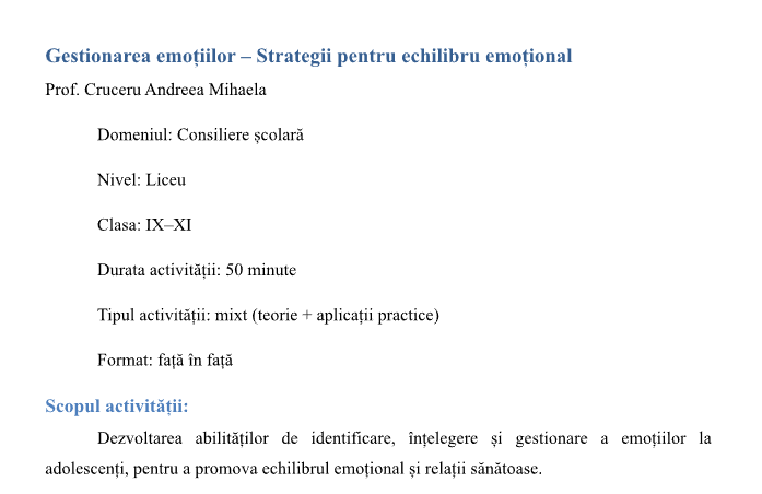 Dezvoltarea abilităților de identificare, înțelegere și gestionare a emoțiilor la adolescenți, pentru a promova echilibrul emoțional și relații sănătoase.