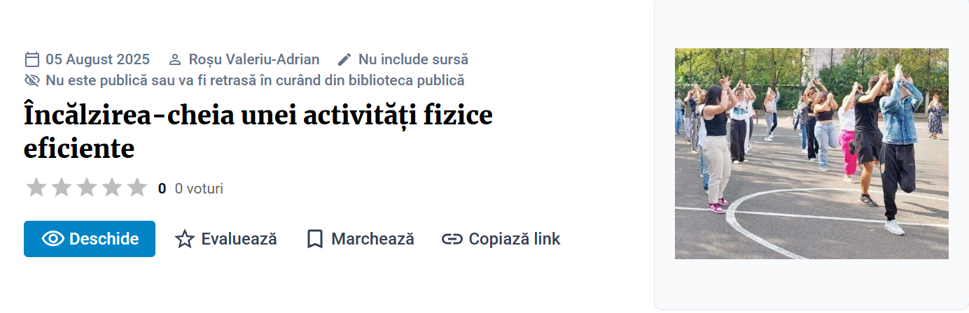 „Încălzirea – cheia unei activități fizice eficiente și sigure”Această lecție își propune să evidențieze importanța încălzirii în cadrul activităților fizice, indiferent de nivelul de performanță sau vârstă. Încălzirea este o etapă esențială care pregătește organismul pentru efort, contribuie la prevenirea accidentărilor și îmbunătățește performanța fizică și mentală.
