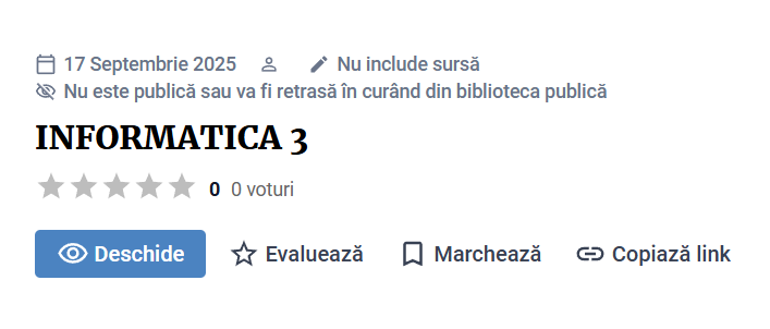 Licență: CC BY-NC-SA 4.0, Atribuire-necomercial-distribuire în condiţii identice 4.0 internaționalConținutul acestui material poate fi utilizat liber cu condiția menționării sursei și, unde e posibil, a autorului. Modificarea este permisă, iar materialele derivate trebuie, la rândul lor, să poată fi utilizate liber și modificate fără restricții.