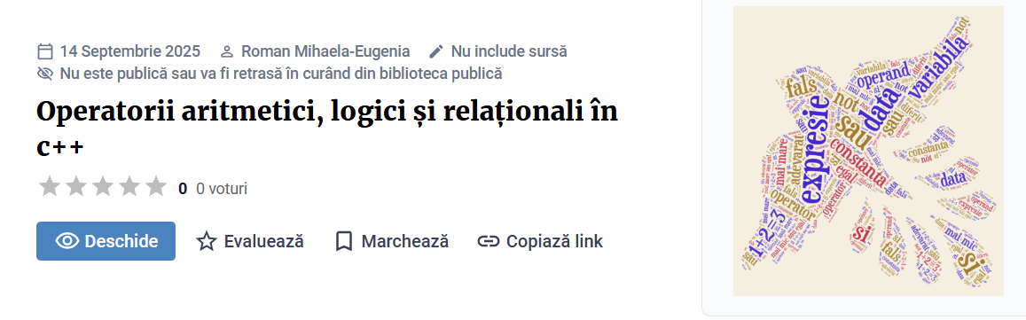 Licență: CC BY-NC-SA 4.0, Atribuire-necomercial-distribuire în condiţii identice 4.0 internaționalConținutul acestui material poate fi utilizat liber cu condiția menționării sursei și, unde e posibil, a autorului. Modificarea este permisă, iar materialele derivate trebuie, la rândul lor, să poată fi utilizate liber și modificate fără restricții.