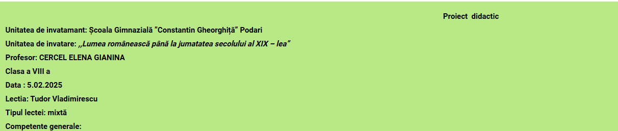 Proiectul didactic propus pentru clasa a VIII-a, la disciplina Istorie, urmărește studierea personalității lui Tudor Vladimirescu și a Revoluției de la 1821, în contextul transformărilor sociale și politice din Europa și din spațiul românesc. Lecția, de tip mixt, îmbină metode tradiționale (explicația, conversația euristică, lucrul cu harta) cu metode moderne (învățarea prin descoperire, brainstorming, analiza documentelor istorice și utilizarea resurselor digitale).Obiectivele vizează formarea competențelor de înțelegere și interpretare a evenimentelor istorice, compararea acestora din perspectivă temporală și spațială, precum și dezvoltarea gândirii critice prin analiza documentelor istorice („Declarația de la Padeș”, „Cererile norodului românesc”). Elevii sunt provocați să își exprime opinii argumentate asupra rolului lui Tudor Vladimirescu și al pandurilor în lupta pentru emancipare.Activitățile didactice sunt variate: recapitulare prin conversație, captarea atenției prin materiale video („Marșul lui Tudor”), descoperirea de noi cunoștințe prin fișe de lucru, jocuri interactive și analiza pe hartă. Evaluarea se face atât pe parcurs (observarea răspunsurilor și participării), cât și final, printr-o temă de reflecție (eseu despre rolul istoric al lui Tudor Vladimirescu).Prin această lecție, elevii își formează nu doar cunoștințe istorice, ci și atitudini civice și reflexive, înțelegând importanța Revoluției de la 1821 în procesul de modernizare a societății românești.