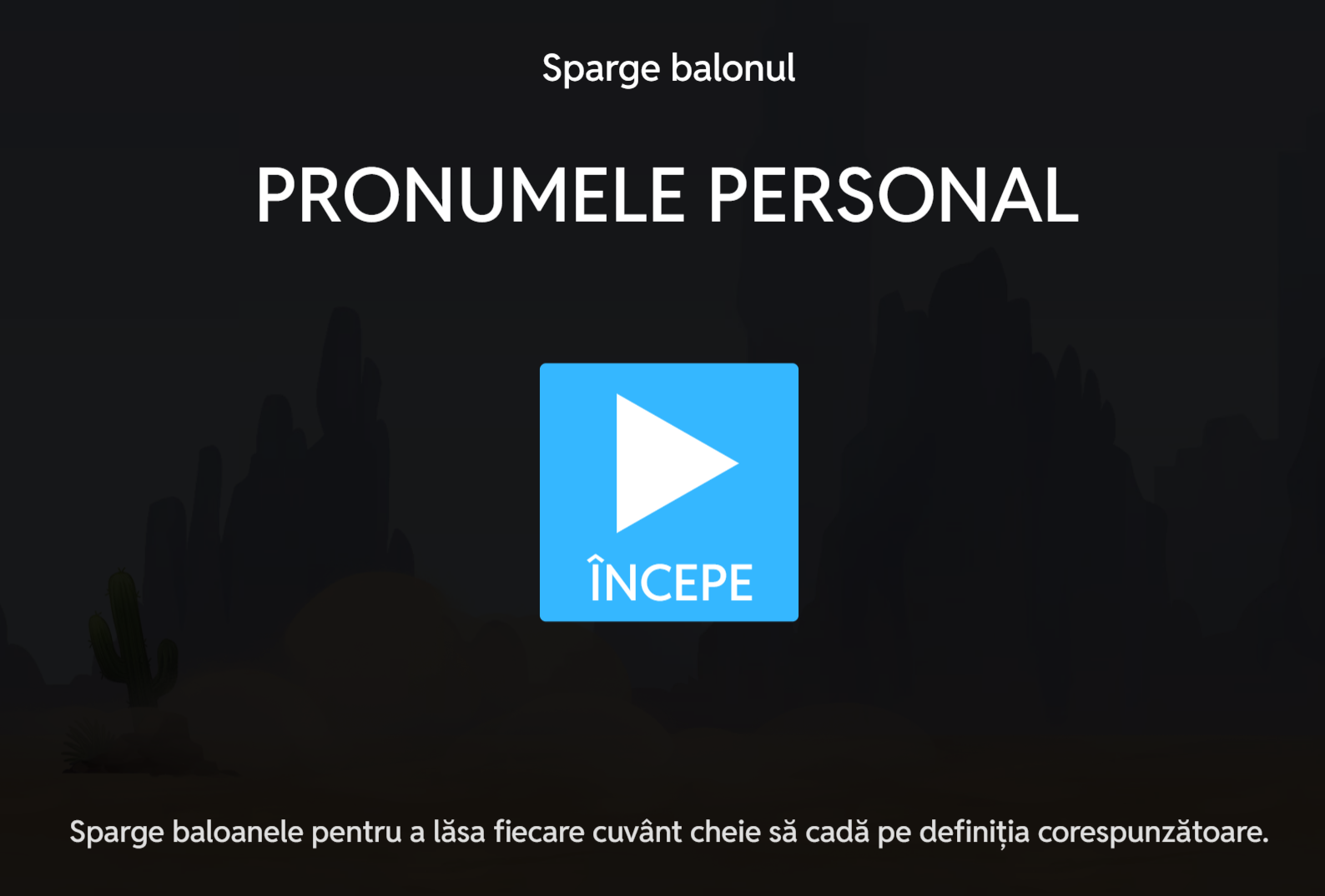 Acest joc poate fi utilizat la clasa a IV-a , în cadrul orei de Limba și literatura română. Activitate are ca scop fixarea cunoștințelor referitoare la formele pronumelui personal. În jocul prezentat – “Sparge balonul!”, elevii au ca sarcină să spargă baloane pentru a lăsa ca fiecare pronume să cadă pe propoziția corespunzătoare formei corecte. Fiecare copil are la dispoziție un minut pentru a reuși să spargă cât mai multe baloane pe care sunt scrise formele pronumelui personal. Este un joc care care poate fi realizat atât individual cât și pe grupe.