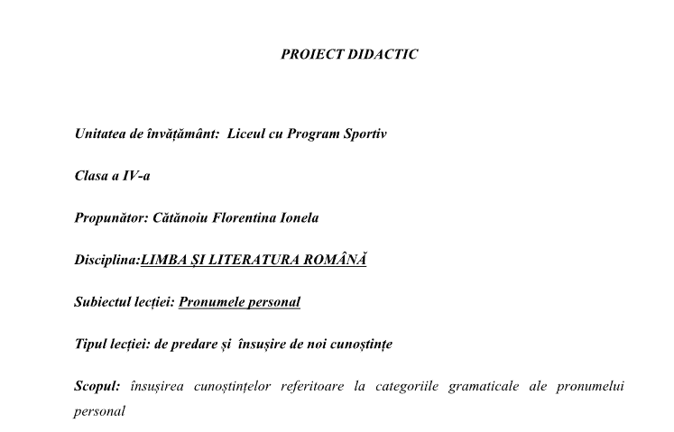 Acest proiect poate fi utilizat la clasa a IV-a , în cadrul orei de Limba și literatura română. În proiect am conceput o oră de predarea având ca subiect “Pronumele personal”. Scopul lecției este de familiarizare a copiilor cu partea de vorbire numită pronume, concomitent cu formarea deprinderilor de recunoaștere a acestuia în propoziții și texte.