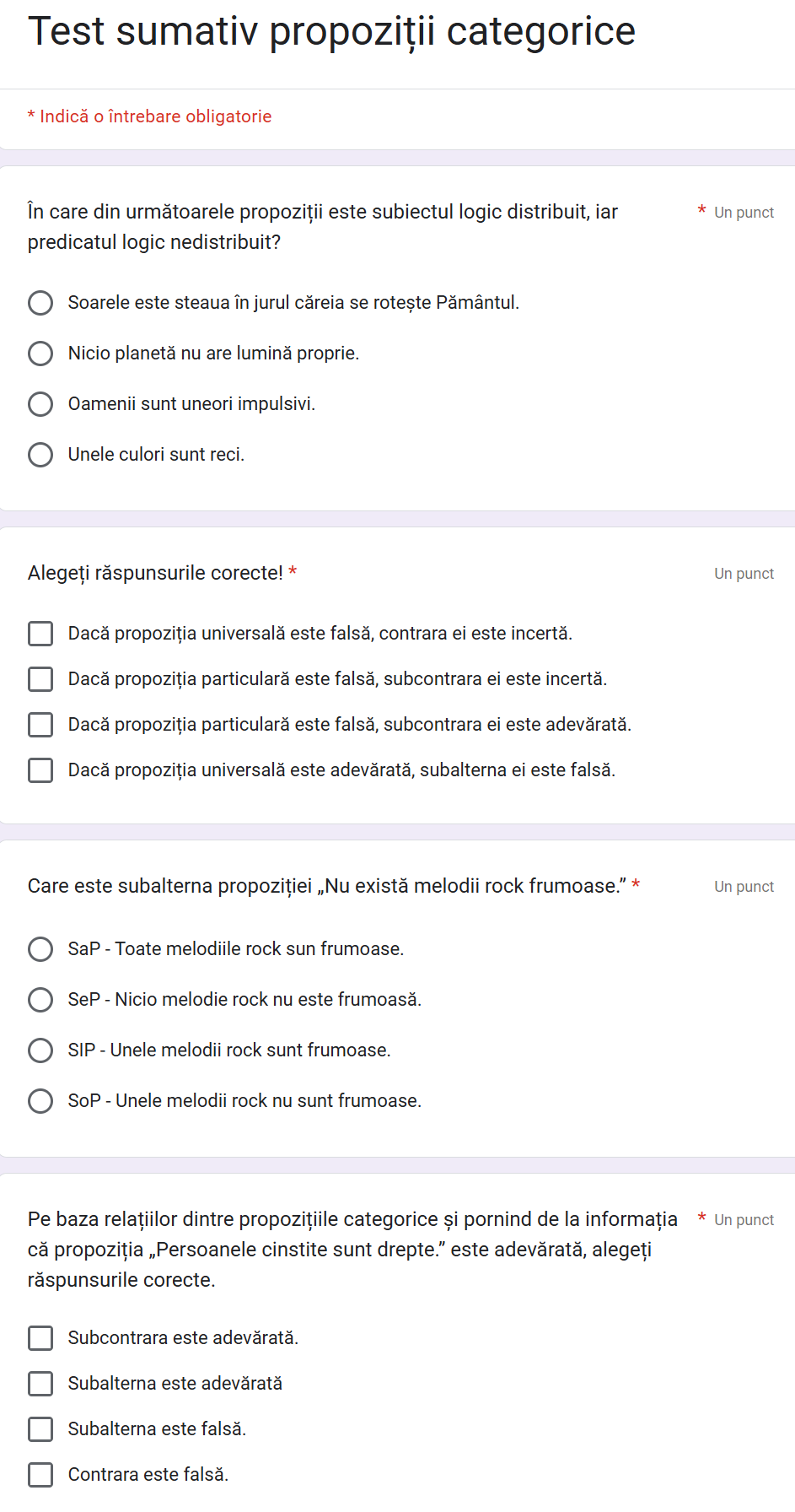 Test de recapitulare Propoziții categorice și relațiile dintre propozițiile categorice