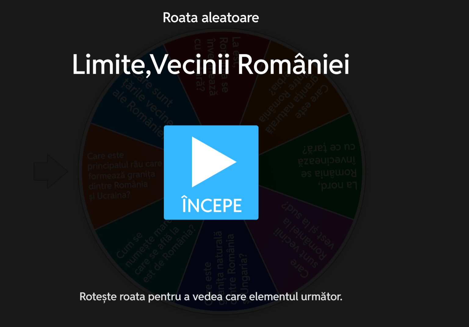 Roata aleatoare – Limite, Vecinii României este un instrument interactiv destinat învățării geografiei României, concentrându-se pe limitele teritoriale și vecinătățile țării. Utilizând o roată aleatoare, elevii pot explora într-un mod dinamic și captivant informațiile referitoare la țările cu care se învecinează România, precum și limitele geografice care o definesc. Această resursă ajută la consolidarea cunoștințelor despre vecinătățile României și dezvoltă abilități de localizare pe hartă.