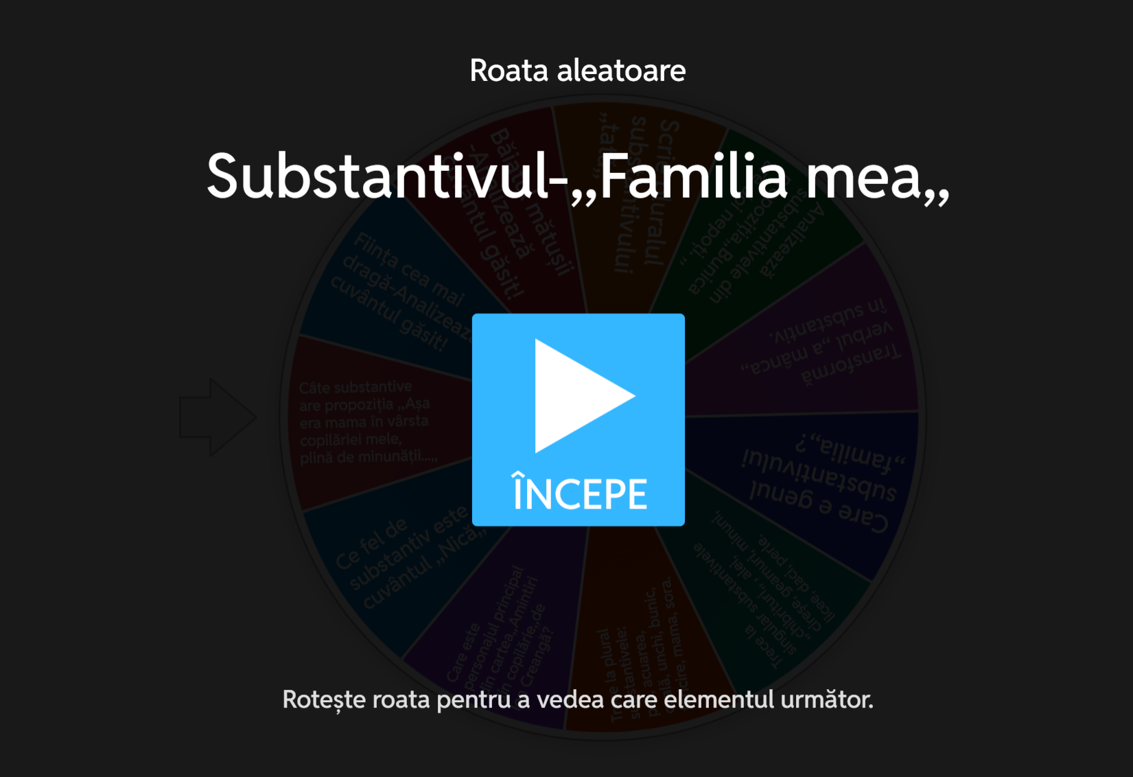 Această activitate interactivă, realizată sub forma unei roți aleatoare Wordwall, este concepută pentru a sprijini consolidarea cunoștințelor despre substantiv într-un mod ludic și atractiv pentru elevi. Tema principală este „Familia mea”, iar cuvintele incluse în roată sunt substantive care fac parte din vocabularul de bază al copiilor. Scopul materialului propus: consolidarea cunoștințelor elevilor și dezvoltarea interesului pentru limba română.