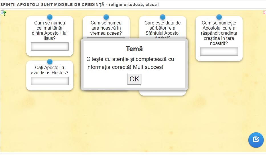 Materialul propus este un exercițiu folosit pentru fixarea cunoștințelor, la clasa I. Exercițiul este lucrat cu instrumente interactive, de tip „Răspuns text liber”, regăsindu-se pe platforma LearningApps la adresa: (https://learningapps.org/display?v=pzjqvax3525).
