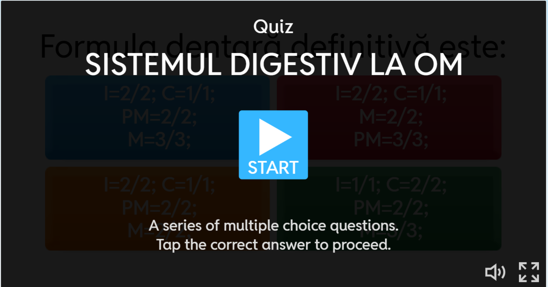 Chestionarul ,, Sistemul digestiv la om,, are scopul de a verifica și evalua cunoștințele elevilor despre anatomia sistemului digestiv la om, parcurgând un set de opt întrebări cu variante multiple de răspuns.