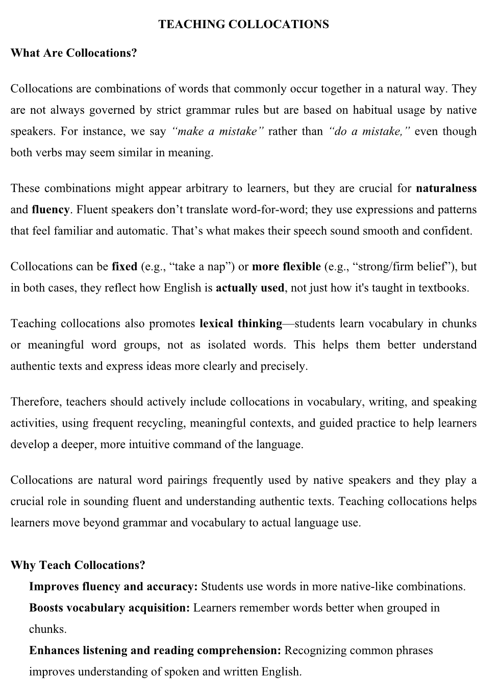 Teaching collocations promotes lexical thinking—students learn vocabulary in chunks or meaningful word groups, not as isolated words. This helps them better understand authentic texts and express ideas more clearly and precisely. Therefore, teachers should actively include collocations in vocabulary, writing, and speaking activities, using frequent recycling, meaningful contexts, and guided practice to help learners develop a deeper, more intuitive command of the language.