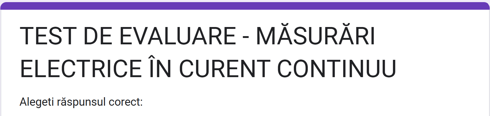 Această resursă este realizată cu un instrument Google numit Forms(Formulare) și este un test de evaluare interactivă, destinat elevilor de liceu profil tehnic, specializarea Tehnician electrician electronist auto, clasa a IX- a – modulul – Măsurări elecrice în curent continuu.Testul include o serie de întrebări aplicative care verifică recapitularea unor concepte esențiale, cum ar fi:– parametrii mărimilor electrice (tensiune electrică, rezistență electrică, intensitatea curentului electric, putere electrică, energie electrică);– aparatele electrice care permit măsurarea mărimilor electrice uzuale.
