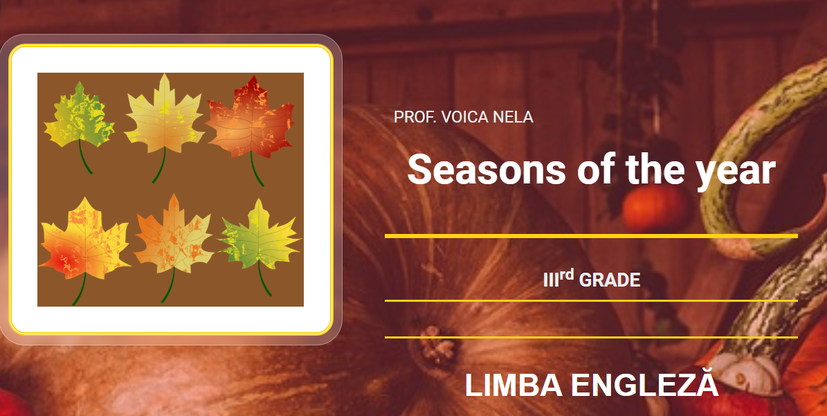 Resursa este un proiect realizat in Livresq, vizează consolidarea vocabularului legat de anotimpuri – pentru începători – și include un text de citit, un video, un cântec și chestionare pentru verificarea însușirii cunosștintelor / a competențelor de speaking, reading, writing și listening.