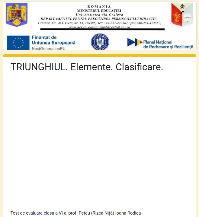 Test de evaluare realizat în Google Forms, cu 10 itemi cu alegere multiplă