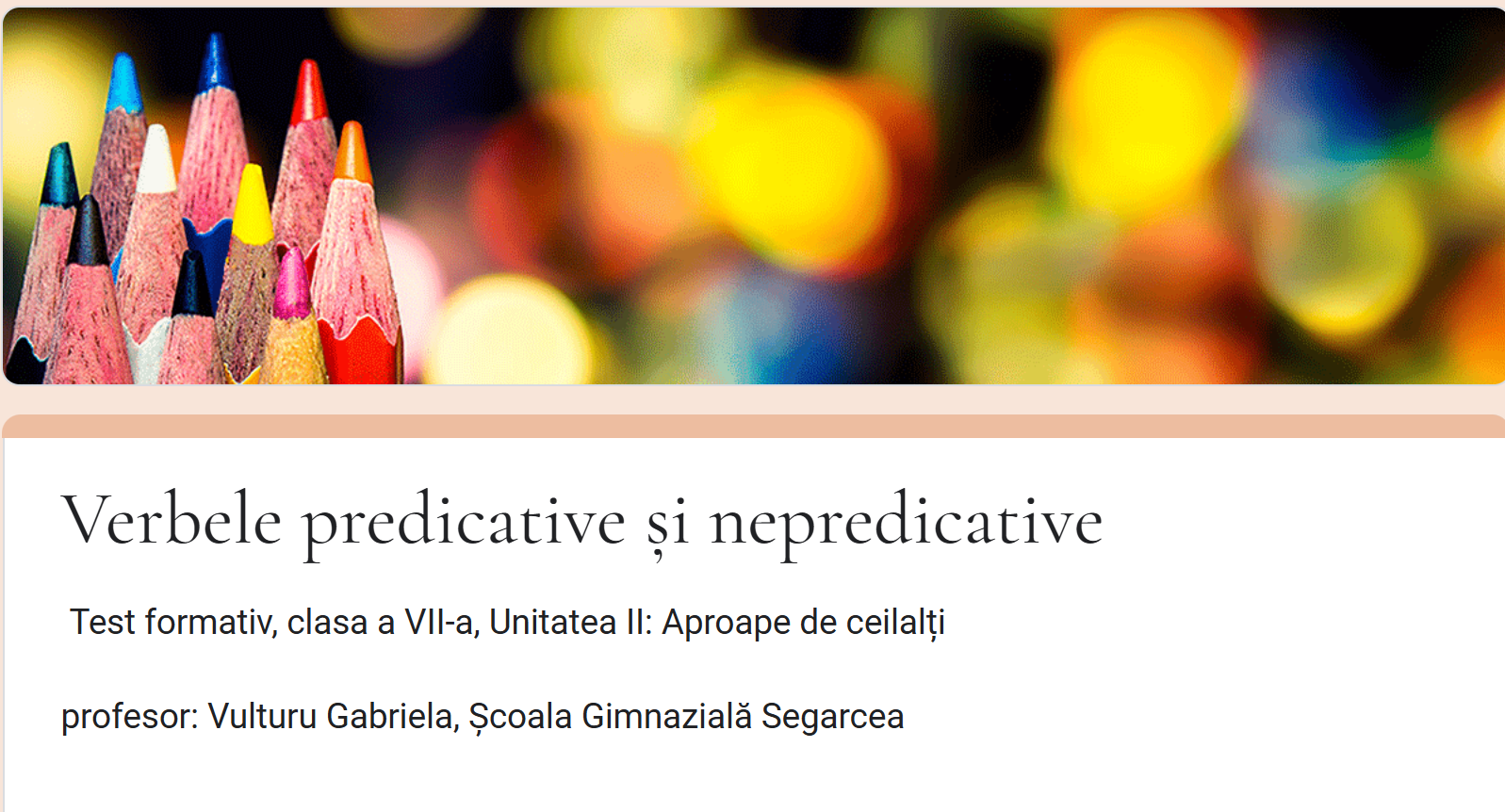 Demersul urmărește să testeze cunoștințele despre verbele predicative și cele nepredicative pe care elevii au reușit să și le însușească pe parcursul unității II. Profesorul va vedea rapid confuziile și își va adapta lecțiile pentru a micșora decalajul creat.
